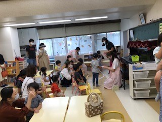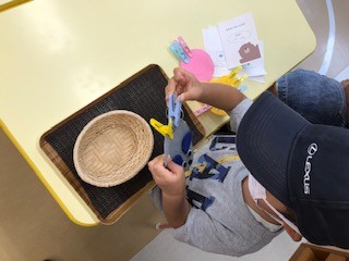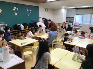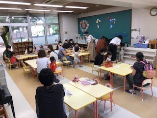 時間は9:30~11:00。13組のお子様・お父様・お母様がお越しくださいました。はじめてのお友達もお母さんと一緒に「おしごと」に取り組むことができました!