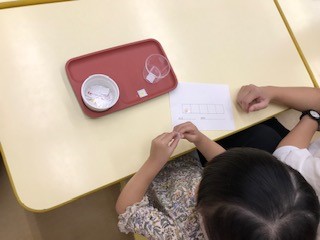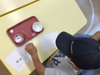 おしごとの流れを紹介します。                                               「自分で選ぶ」➡「自分で運ぶ」➡「繰り返し行う」➡「自分で片付ける」                            お片付けの時に気を付けていることは、「元にあったところに戻す~次に使う人のために」です。                 「同じシールのところに戻そうね」と声を掛けながら。次からは声を掛けなくても自分で戻せます。小さな喜びが胸いっぱいに広がります!!達成感(^^♪