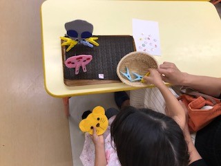 せんたくばさみをつかって:今回はじめて出したおしごとです。フェルトの動物たちに「おひげ」(せんたくばさみ)を付けてあげます。