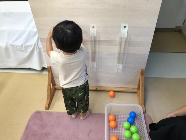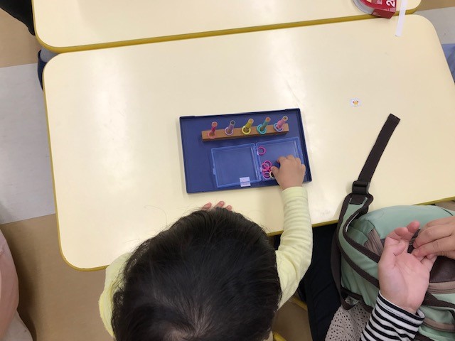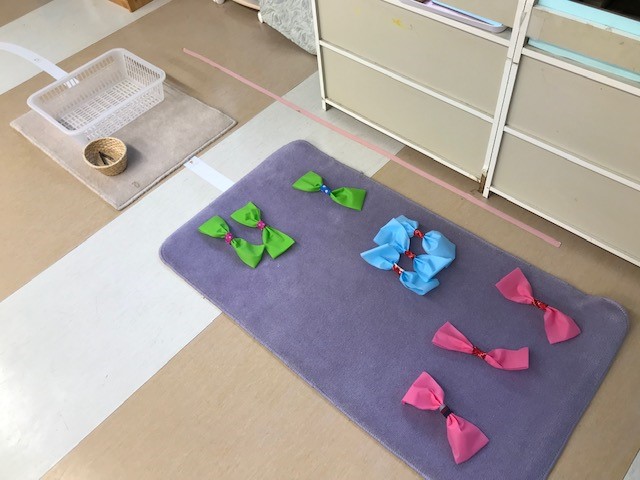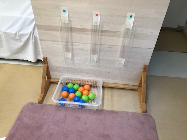 新しい教具「リボンをトングにはさんで、かごに移す」「ボールを同じ色の筒から落とす」です。