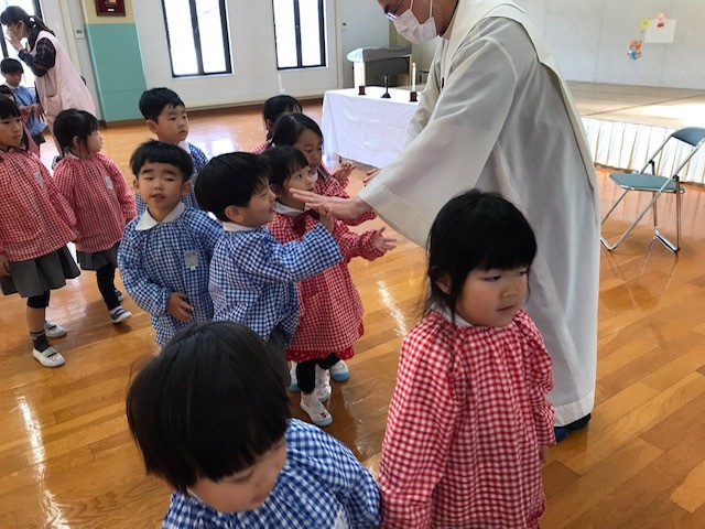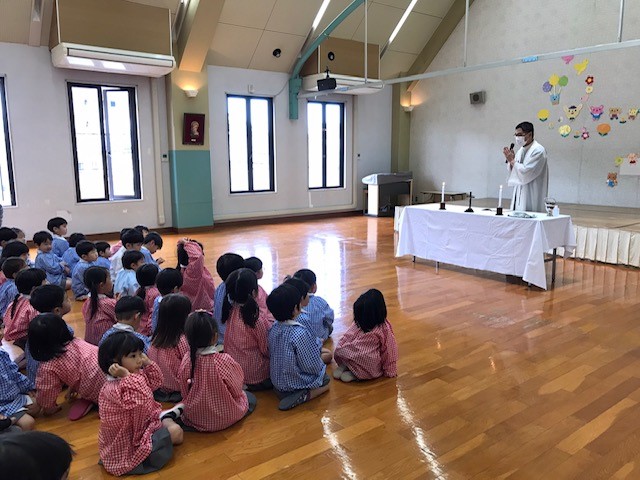4月26日(水) 子どもの日祝福式 活動ブログ 2023年5月15日 今年度の子どもの日祝福式は、園内で行いました。 カトリック帯山教会のキム神父様が園に 来てくださってお祈りを一緒にしました。 この日は、祝福をしていただいた柏餅を持ちかえりました😊 園庭には、大きな鯉のぼりを飾って子どもたちの成長を祈っています。