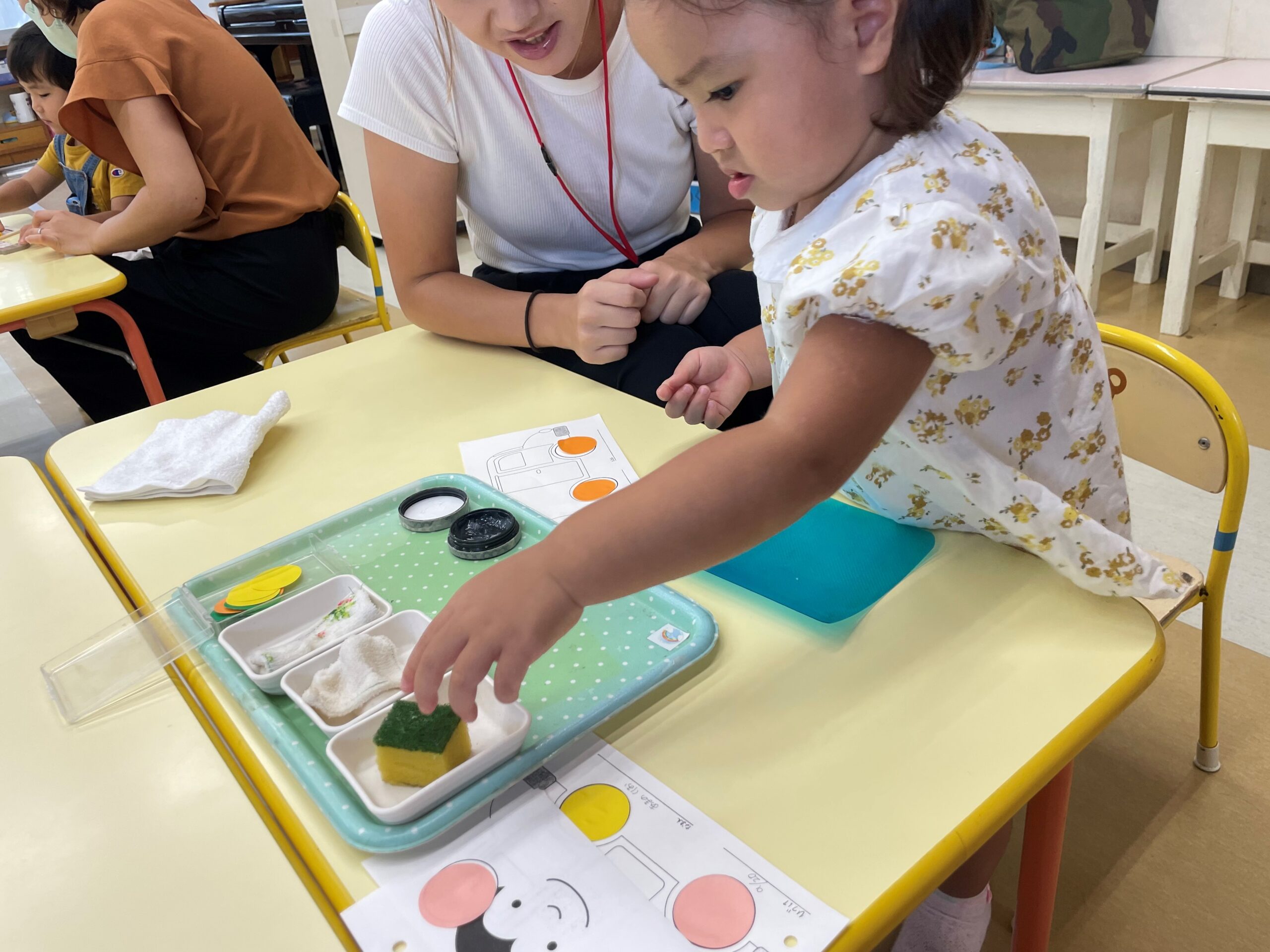貼るおしごとの種類はいくつかあります😊第2回ぽっぽ組のブログにも書きましたが、シール貼りもそのひとつです。のり貼りのおしごとは、のりを指に付ける→貼る紙の裏に塗る→台紙の形に合わせて貼る というものです。この写真のお友だちは、台紙の上に紙を置いてスポンジで押さえている写真です✨とても集中していて、数枚繰り返していました。