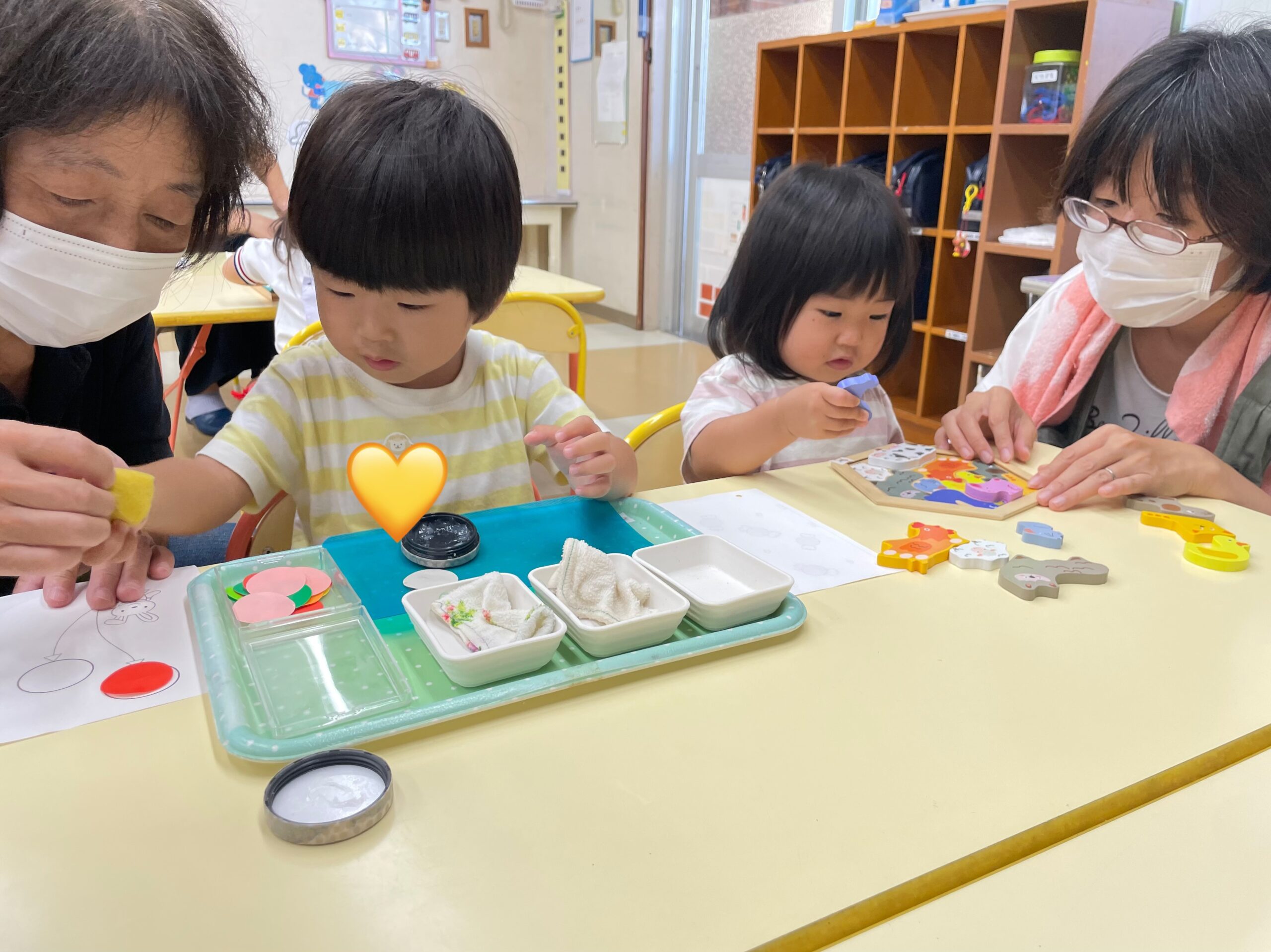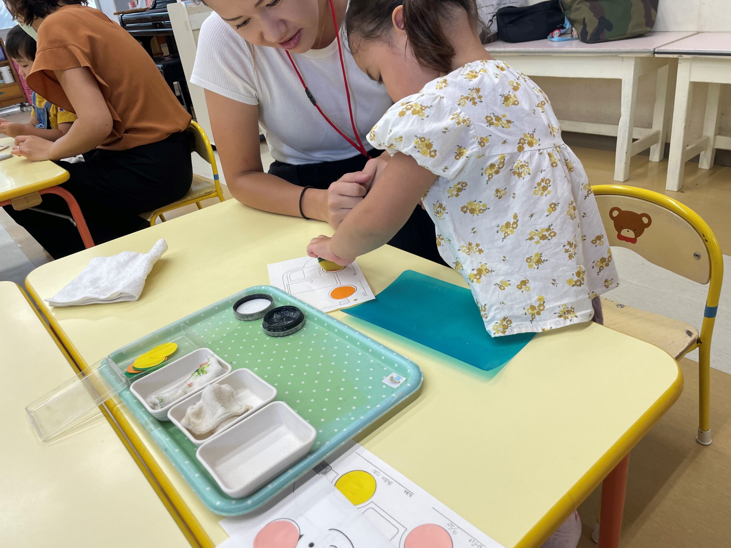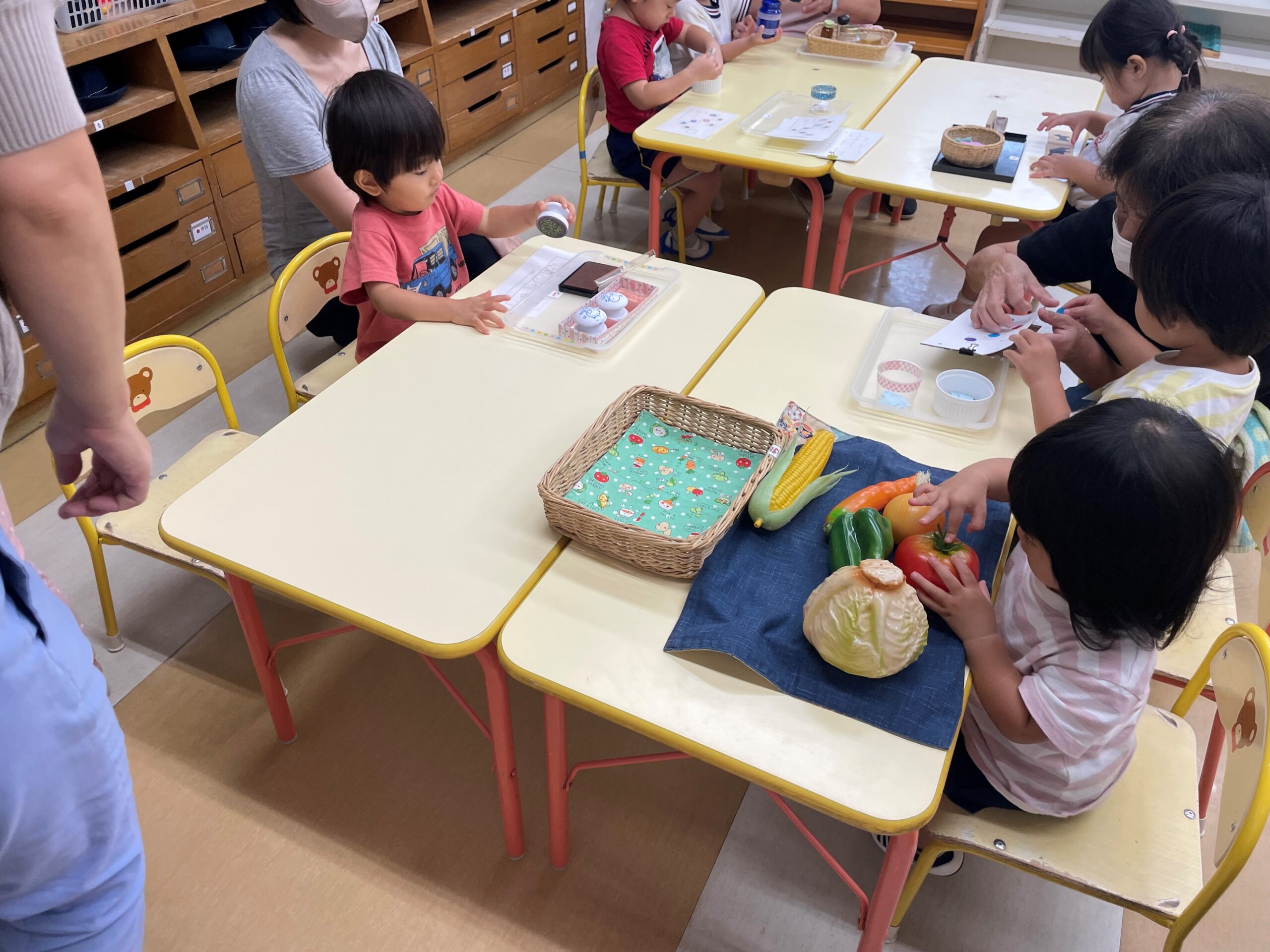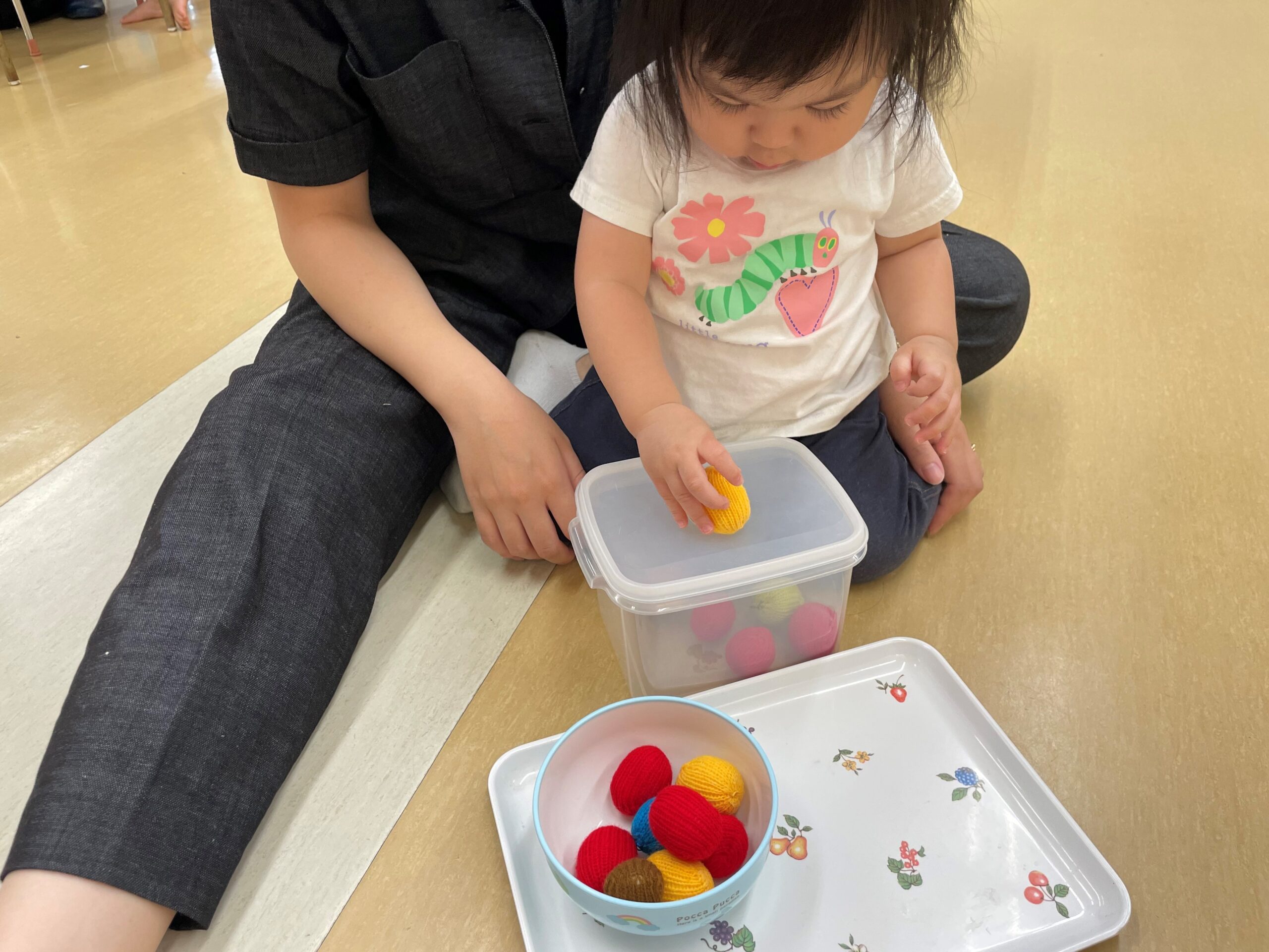 2歳児クラスと隣のこあら組の部屋に分かれて、おしごとの時間を過ごしました。
