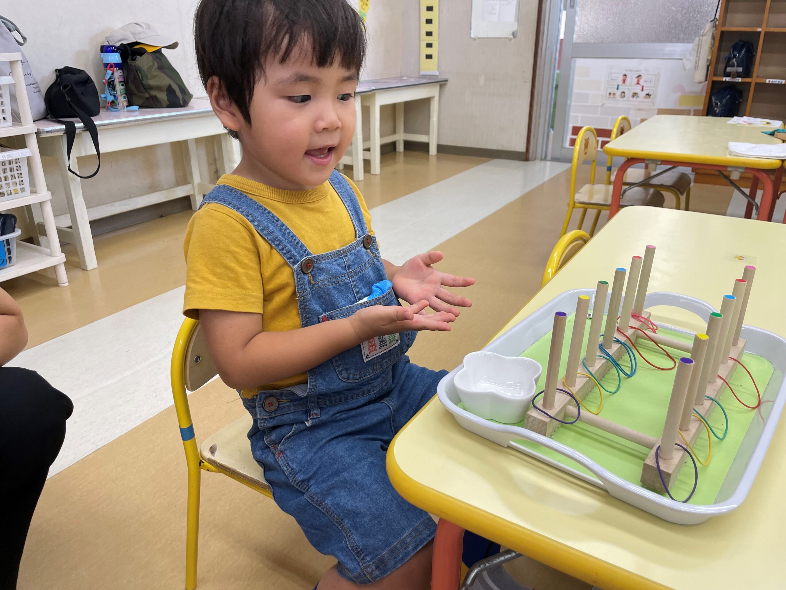 (↑ゴムかけ)色がついている棒に、ゴムをかけるおしごとです。色をしっかり見てそのゴムをかけることが出来ました😊写真を撮っていいか尋ねたところ、「じゃじゃーん!」と見せてくれました✨