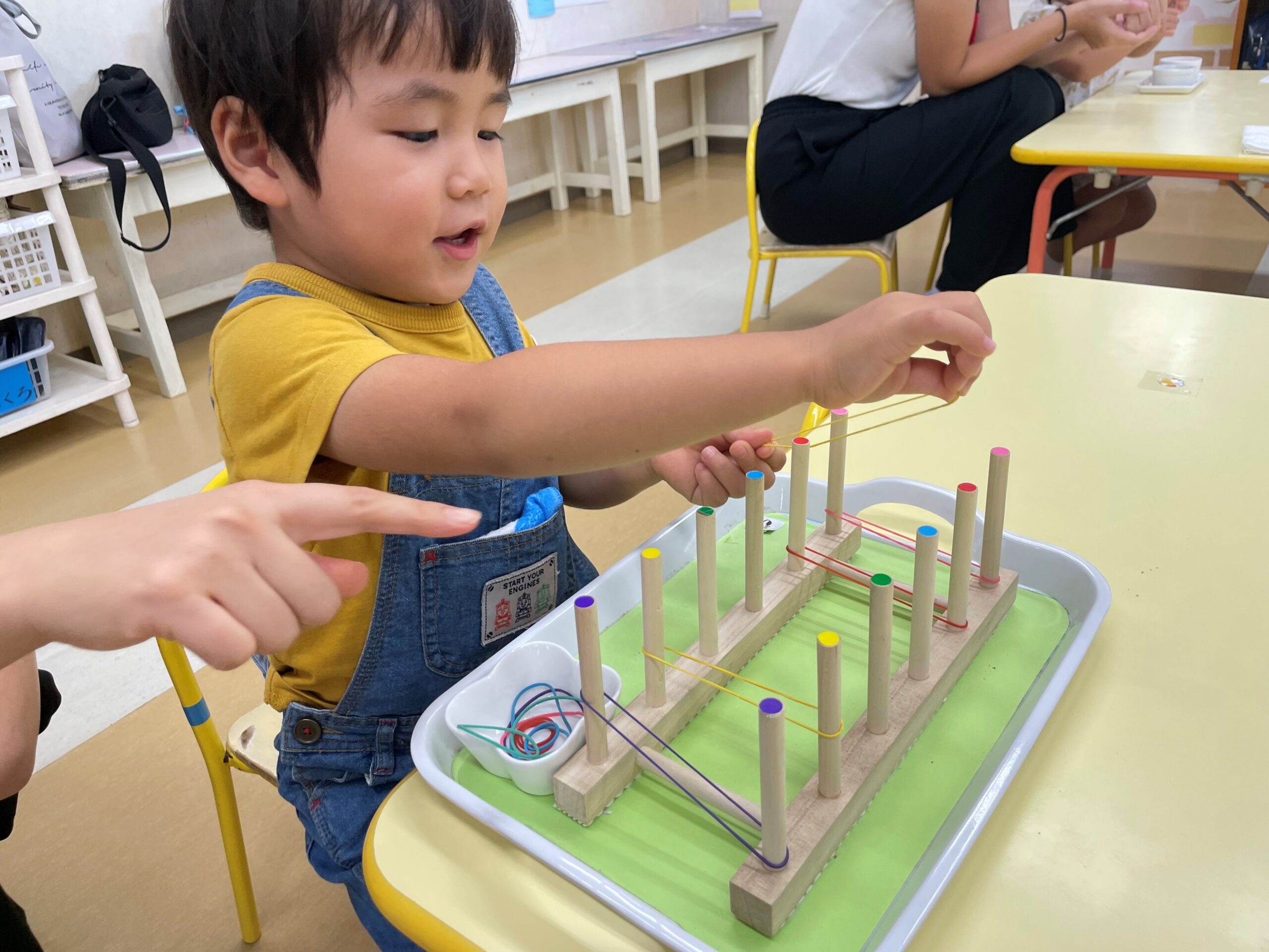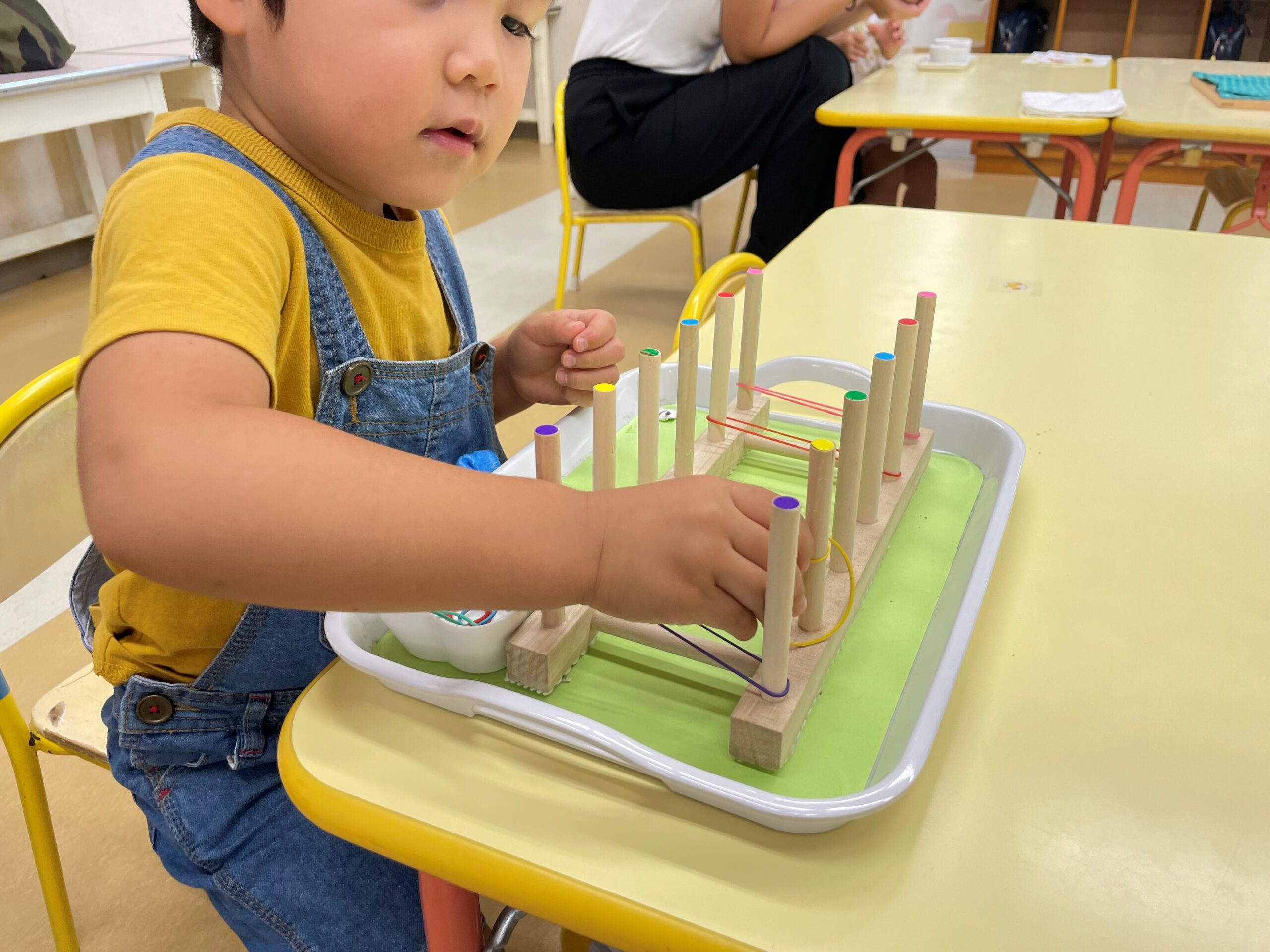 このおしごとは、1つのゴムを両手で伸ばして2本の棒にかけるやり方もありますので、教師が提示しました。それを見ていたお子さんは、教師の動きを真似してすべてのゴムをかけていました!