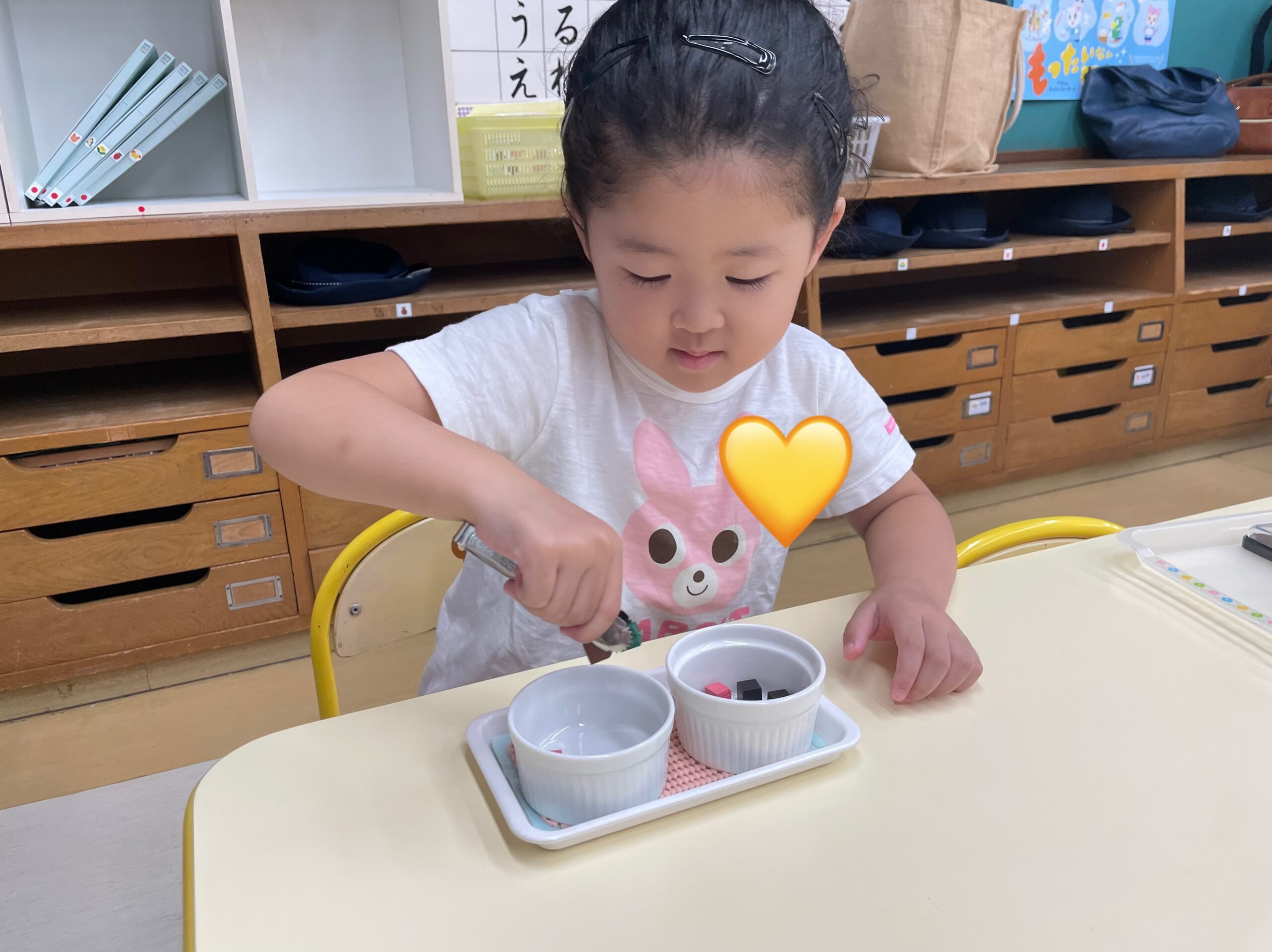 マリアこども園で言っている『おしごと』は、モンテッソーリ活動のことです。おしごとは、子どもが自分で選択し取り組みます。教師は、そのおしごとのやり方を提示します。まずは、道具の名称を伝え、おしごとのやり方を動きで見せるようにしています。