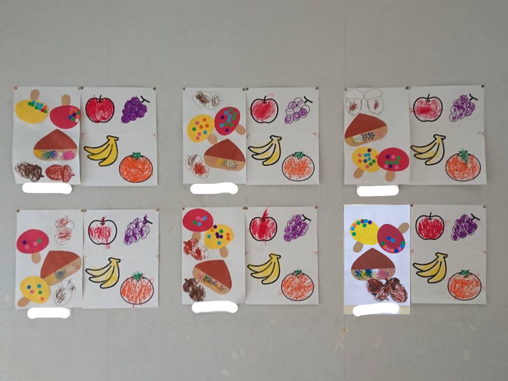 こばと組は、秋をテーマにおしごとの一環で制作を行いました。きのこ・くり・どんぐりをつくり、自分で貼り付けまでやりました!クレヨンで果物のぬりえにも挑戦し、色を確認しながら楽しく制作に取り組むことが出来ました✨