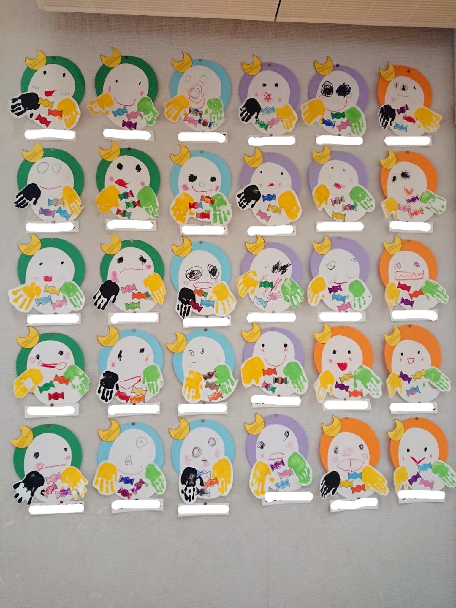 年少児は、おばけをテーマにハロウィンを楽しみました。手形とキャンディは好きな色を選び、キャンディを塗るときには隙間がないように気を付けて塗ることができました!おばけの顔は、目や口の位置を確認しながら描き、かわいらしいおばけが出来上がりました👻