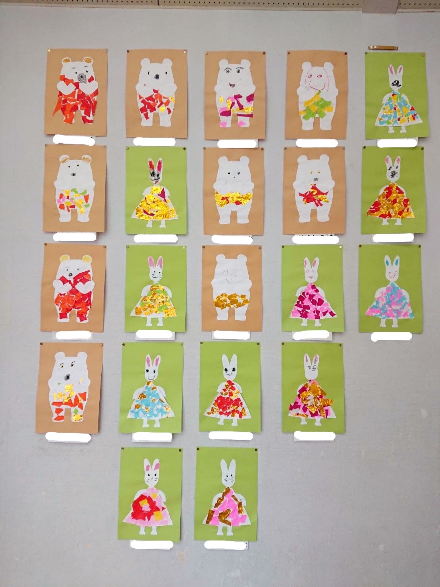 年中児は、絵本「しろくまのパンツ」と「わたしのワンピース」の好きな絵本を選び、パンツとワンピースの飾りつけをしました。折り紙をちぎって貼り、どんなパンツにしようかな?好きな色のワンピースにしようかな!と想像を膨らませながらつくりました😊