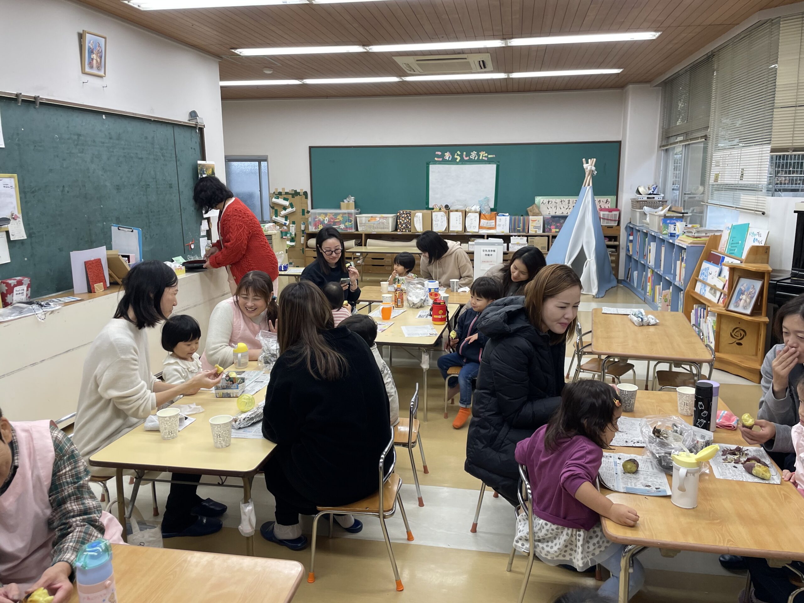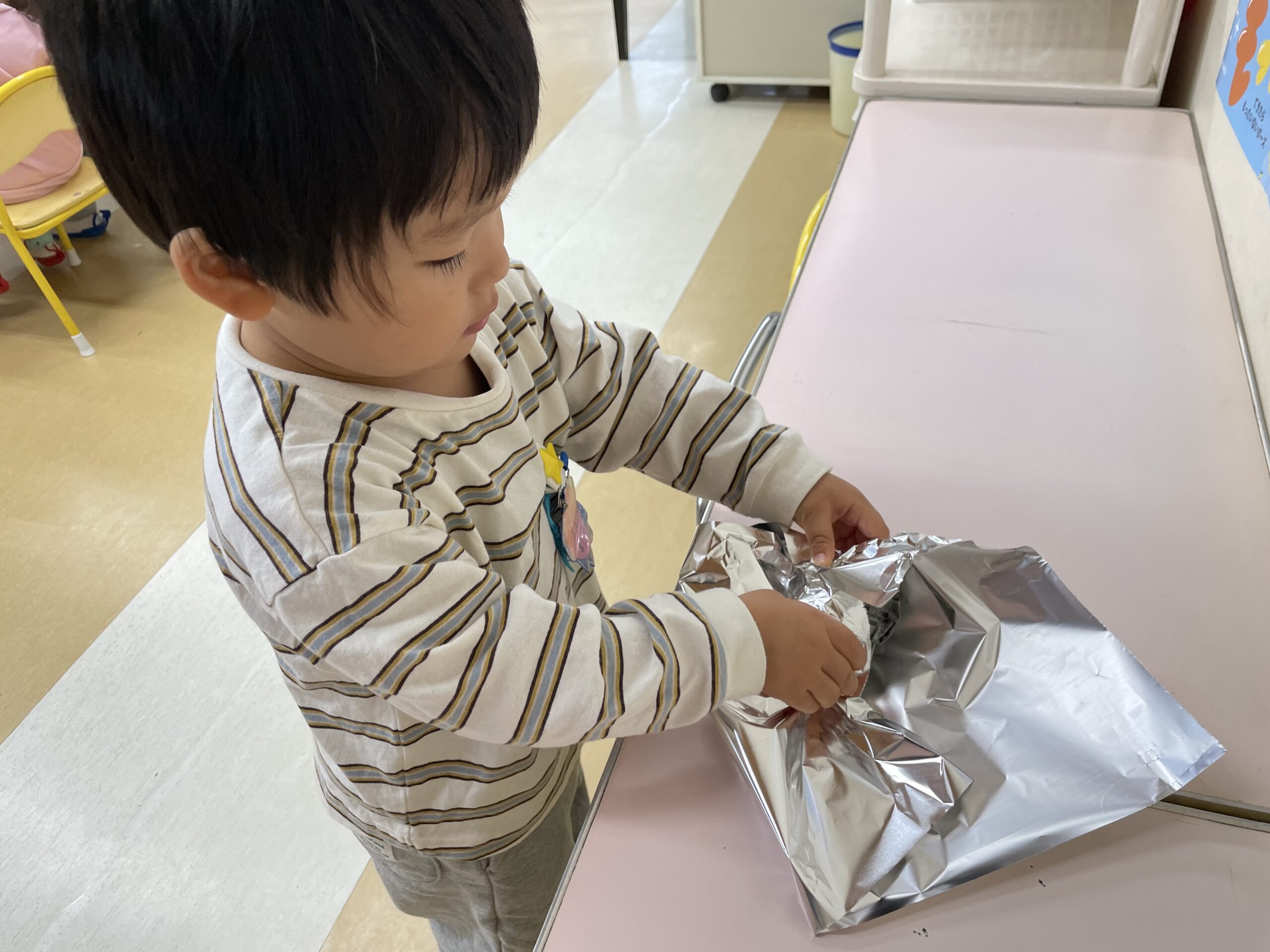 朝から、子どもたちが自分でサツマイモに新聞紙とアルミホイルを巻いて準備をします🍠