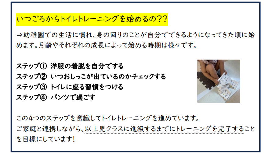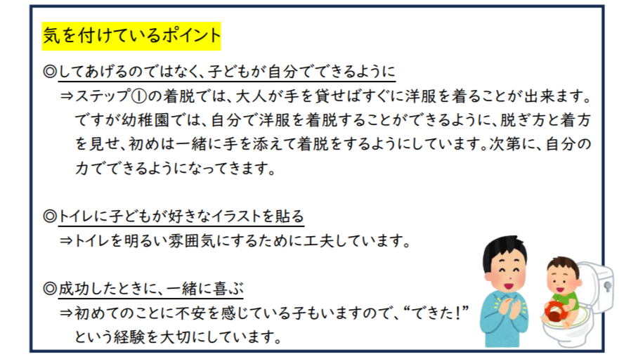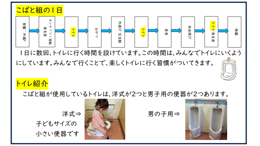 トイレトレーニング コンテンツ集 2024年5月7日 マリアこども園には、こばと組(2歳児クラス)があります。 こばと組に入園してくるお友達は、お家の方と離れて幼稚園で集団生活をするのは初めての方がほとんどです。 幼稚園で1日過ごす中で、先生やお友達と関わったり、食事をしたり、排泄をしたり、自分の身の回りのことを自分でできるようになってきます。 その中で、トイレトレーニングはこばと組(2歳児クラス)で取り組んでいることの一つです。