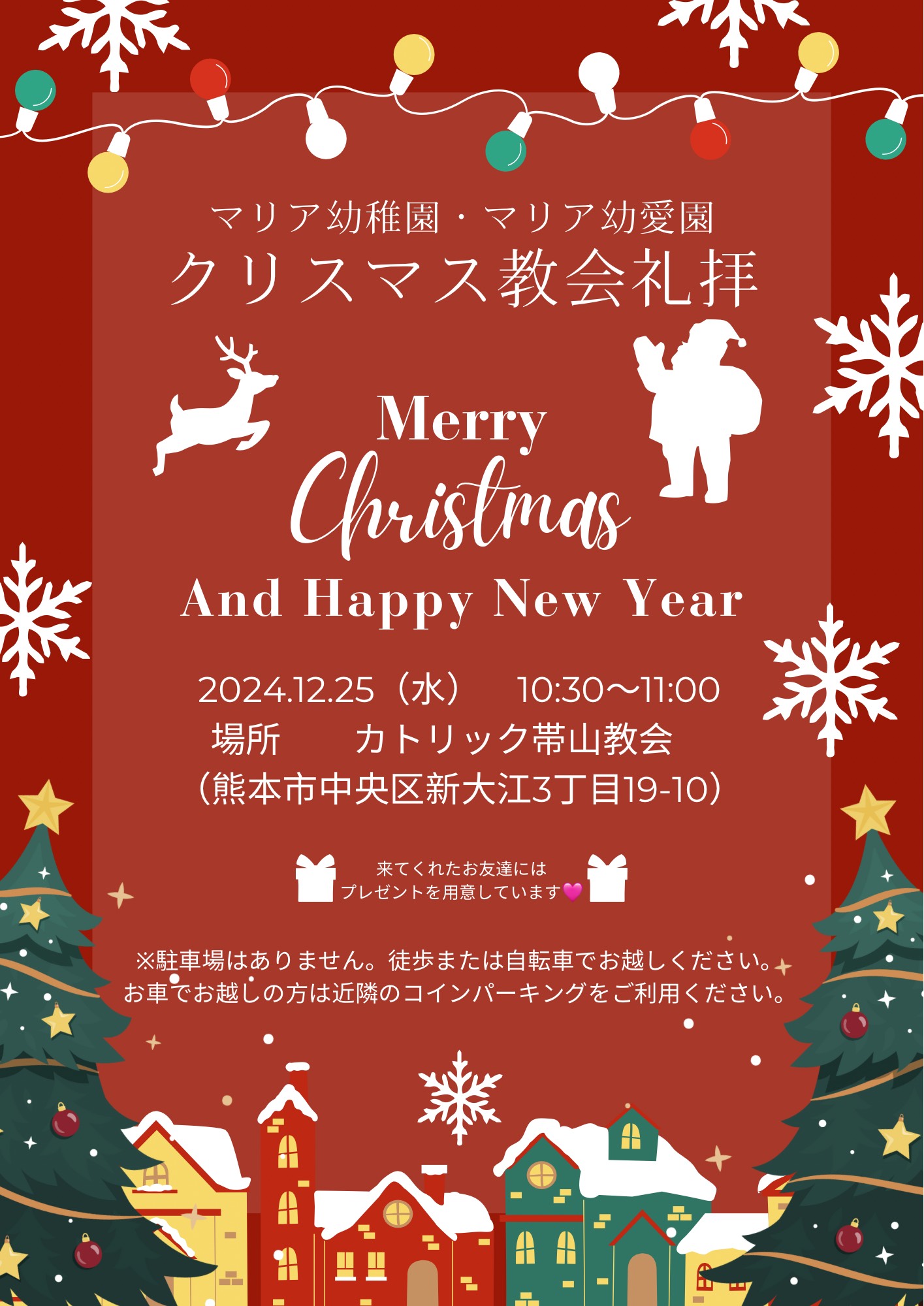 クリスマス教会礼拝のご案内 お知らせ 2024年12月23日 2024年12月25日(水)10:30~ クリスマス教会礼拝を行います🎄 カトリック帯山教会にて、みんなでクリスマスのお祝いをしましょう♪ 幼稚園に登園しているお友達や、そのご兄弟、ぽっぽ組に参加してくださっているお友達もぜひお越しください😊(申し込みは不要です) 当日、来てくださった方にはプレゼント🎁を用意してます✨ ※駐車場はありませんので、徒歩または自転車でお越しください。ご協力よろしくお願い致します。