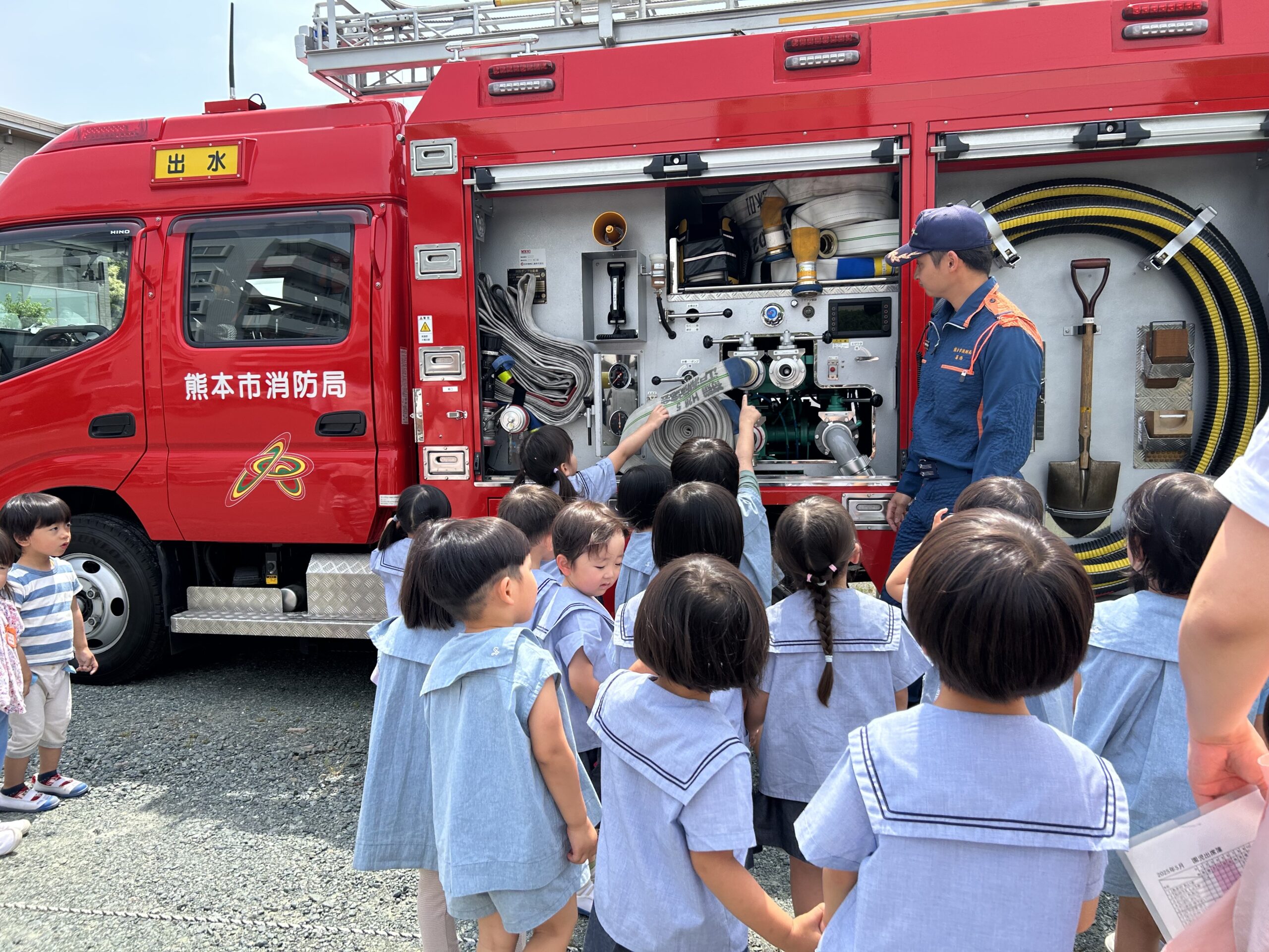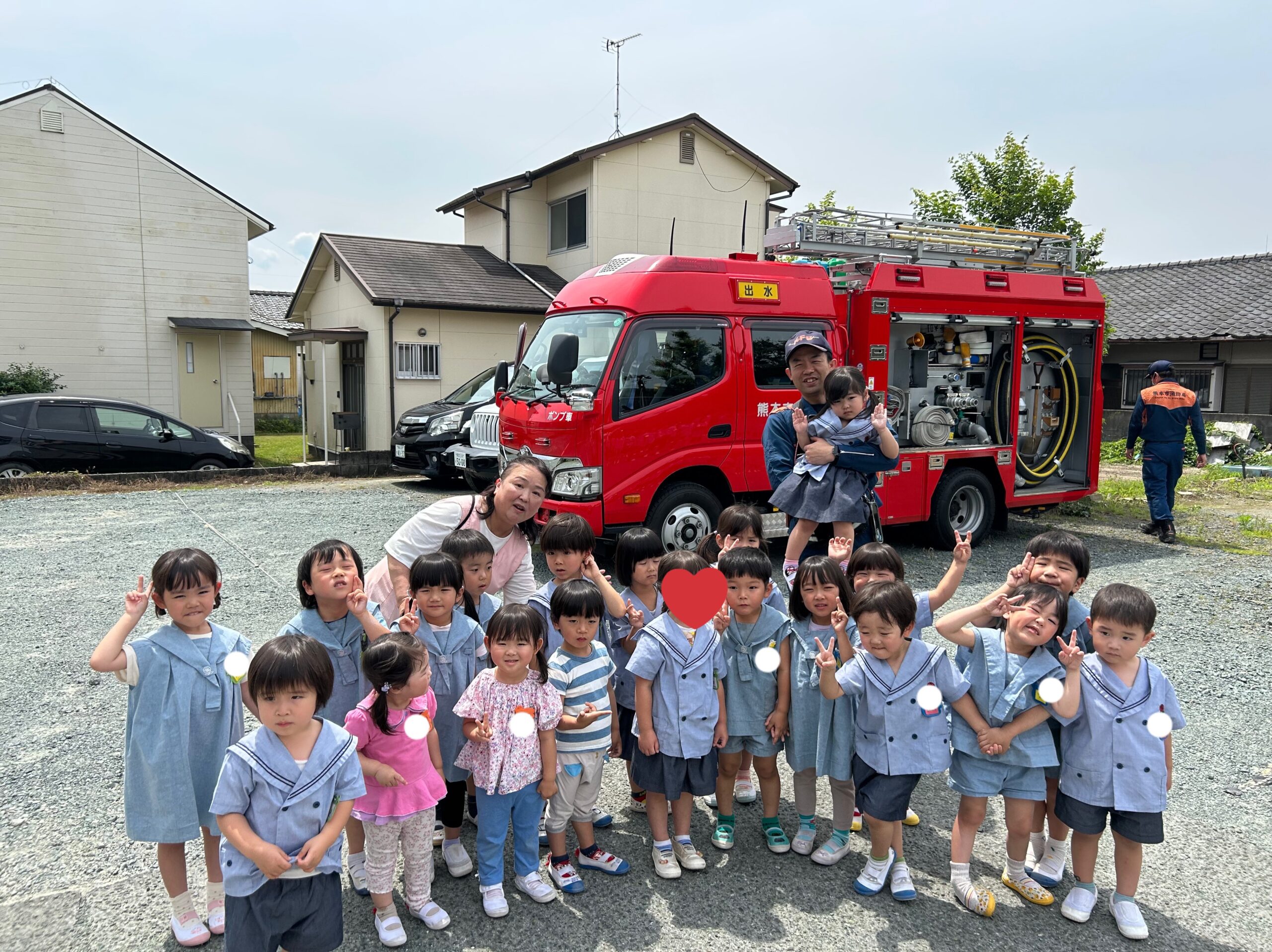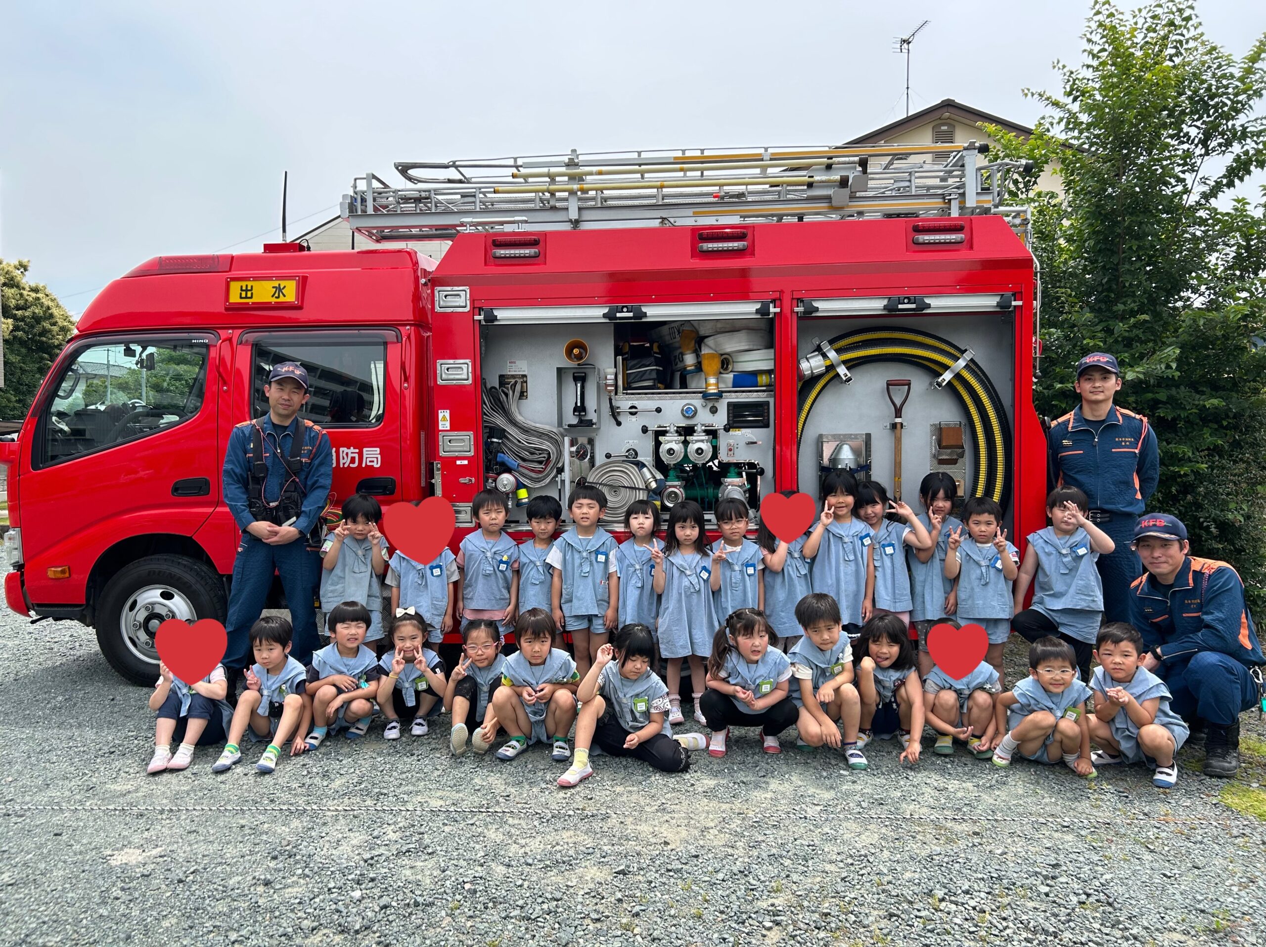 避難訓練が終わった後は、年長は幼年消防団結成式、こばと組・年少・年中は消防車の中を見せていただきました😊
